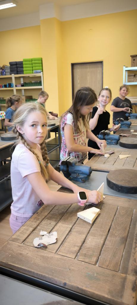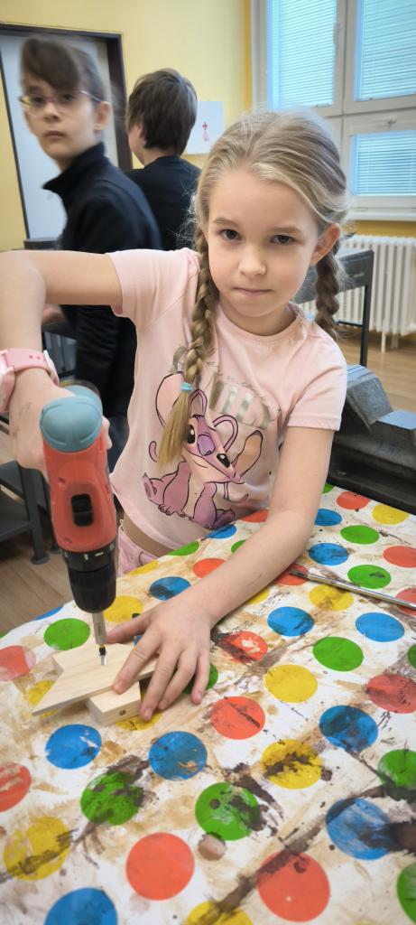Žáci 4. B si v technických dílnách vyrobili zápich do květin ve tvaru anděla. Děti si vyzkoušely práci se dřevem a zjistily, že to není jen o síle, ale hlavně o trpělivosti a pečlivosti.