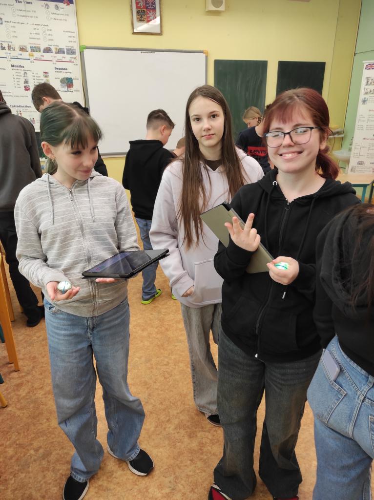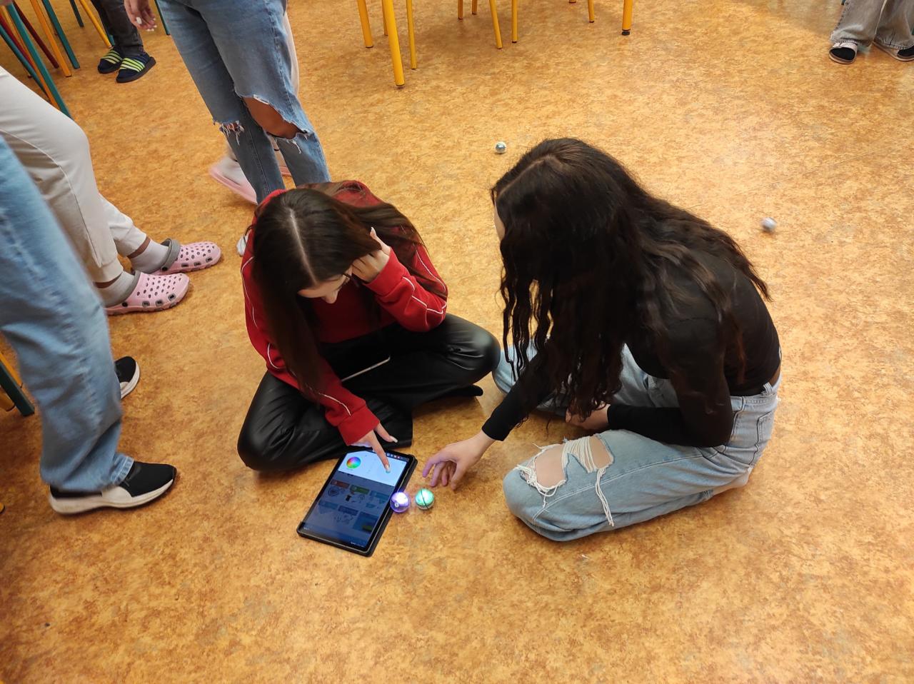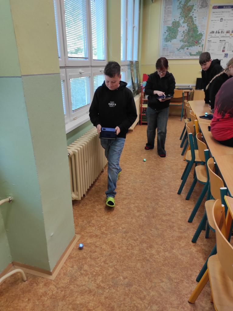 Hodina informatiky 7.ročníků. Závody v ovládání robotické koule SPHERO MINI: