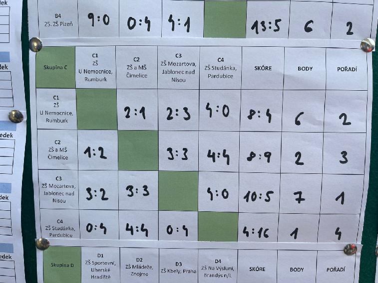 O úspěchu vypovídá to, že celý turnaj rozehrálo více než 4000 škol z celé ČR. Naši kluci po výhrách v okresních a krajských finále se dostali mezi ty nejlepší a na stadionu v Uherském Hradišti nakonec skončili na krásném 6. místě. V úvodu nás čekala skupina se zástupci Jihočeského, Pardubického a Libereckého kraje. Ta měla následující průběh: