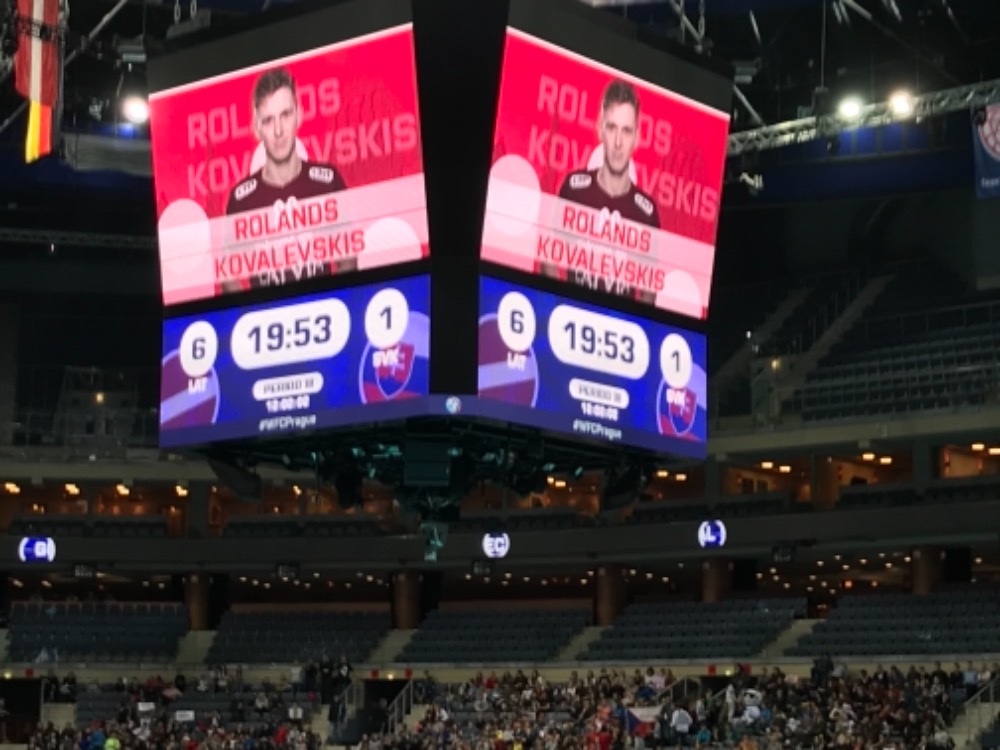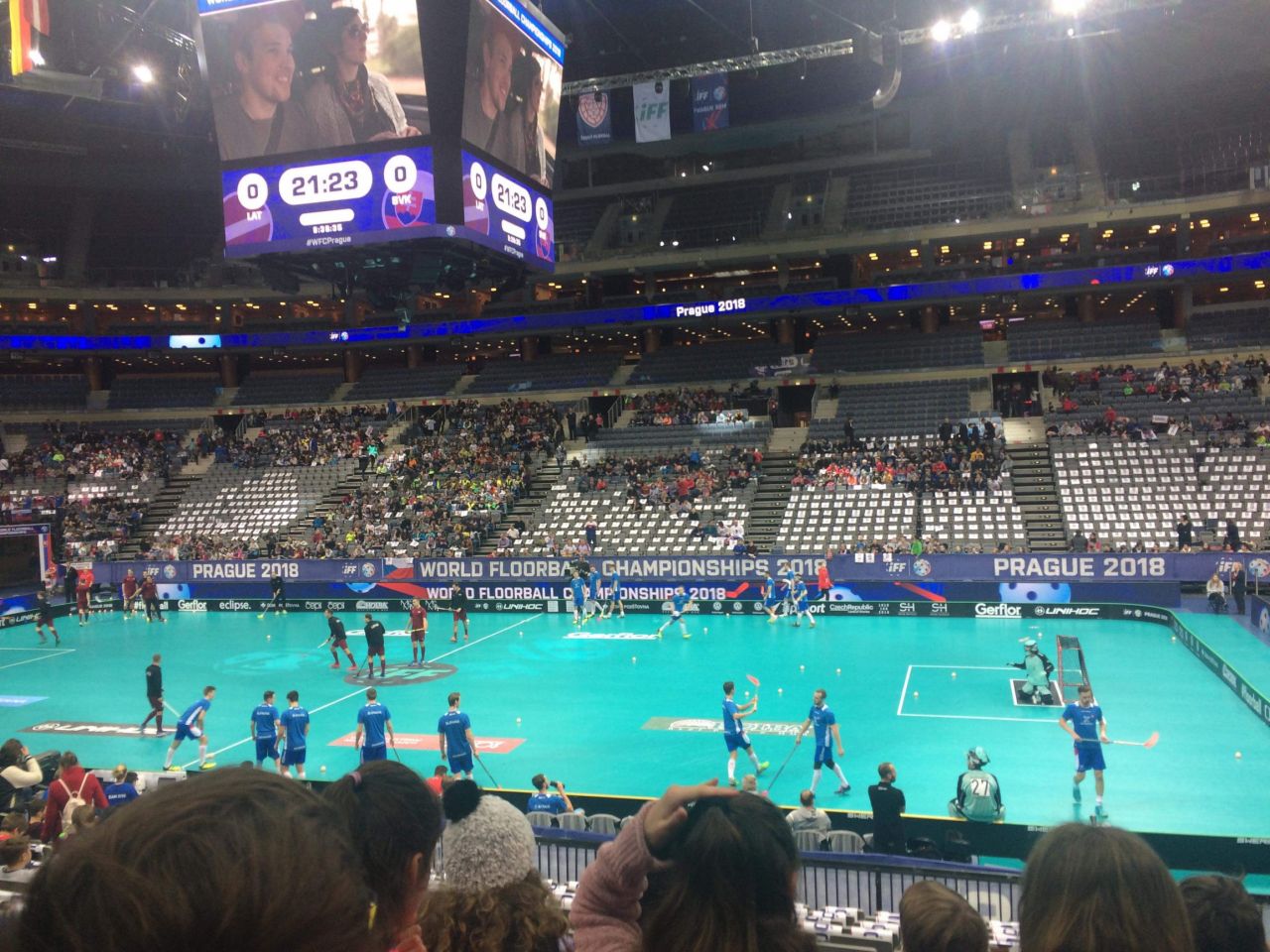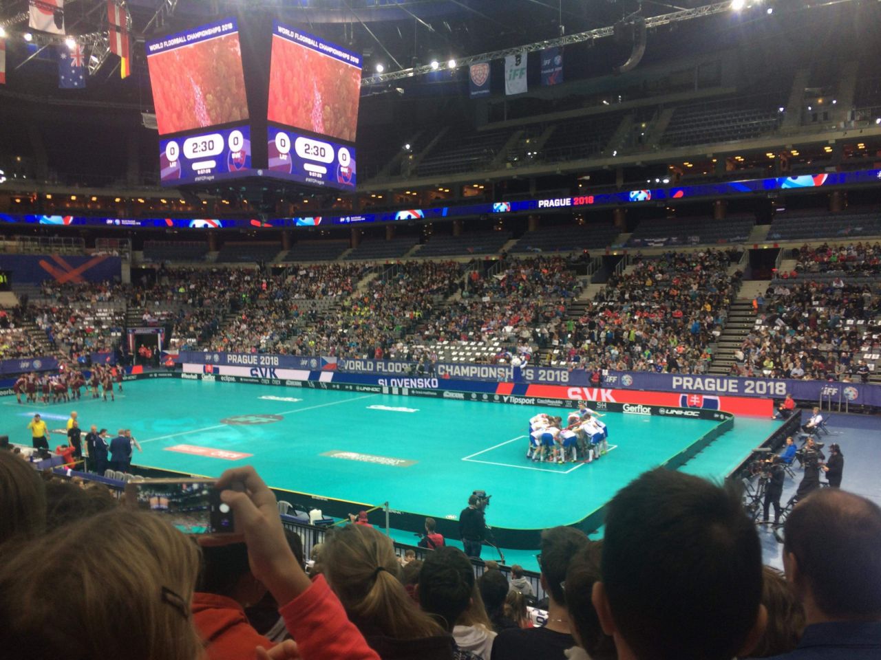 Viděli jsme dvě utkání. V 10:00 Lotyšsko : Slovensko a ve 12:45 Dánsko : Estonsko. Atmosféra byla úžasná, na prvním zápase bylo přes 7000 diváků. Během přestávek probíhaly soutěže, komentátoři se starali o mexické vlny a hlasitost fandění a maskot Floorian pobíhal po celé aréně. Byl to krásný sportovní zážitek.