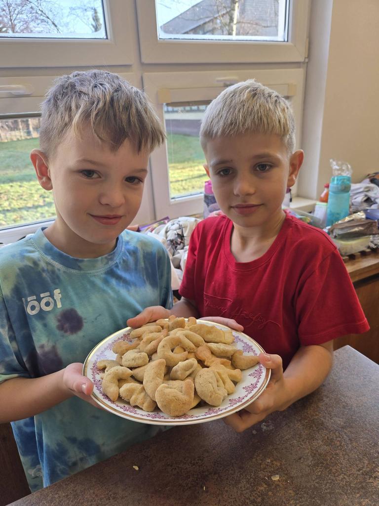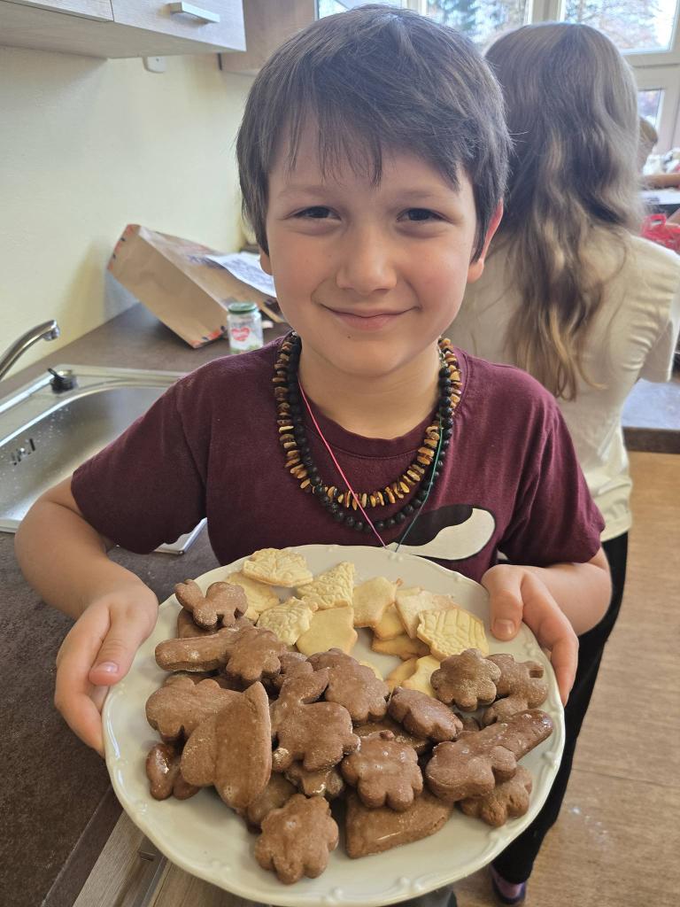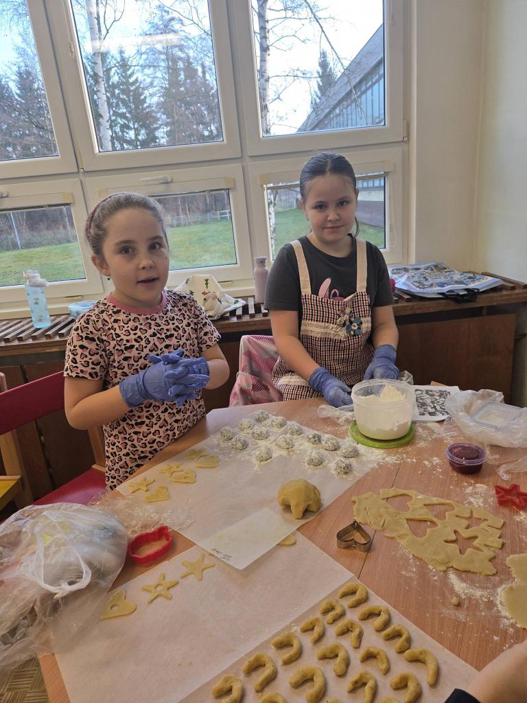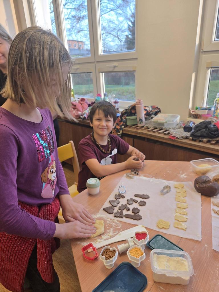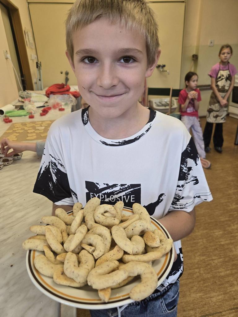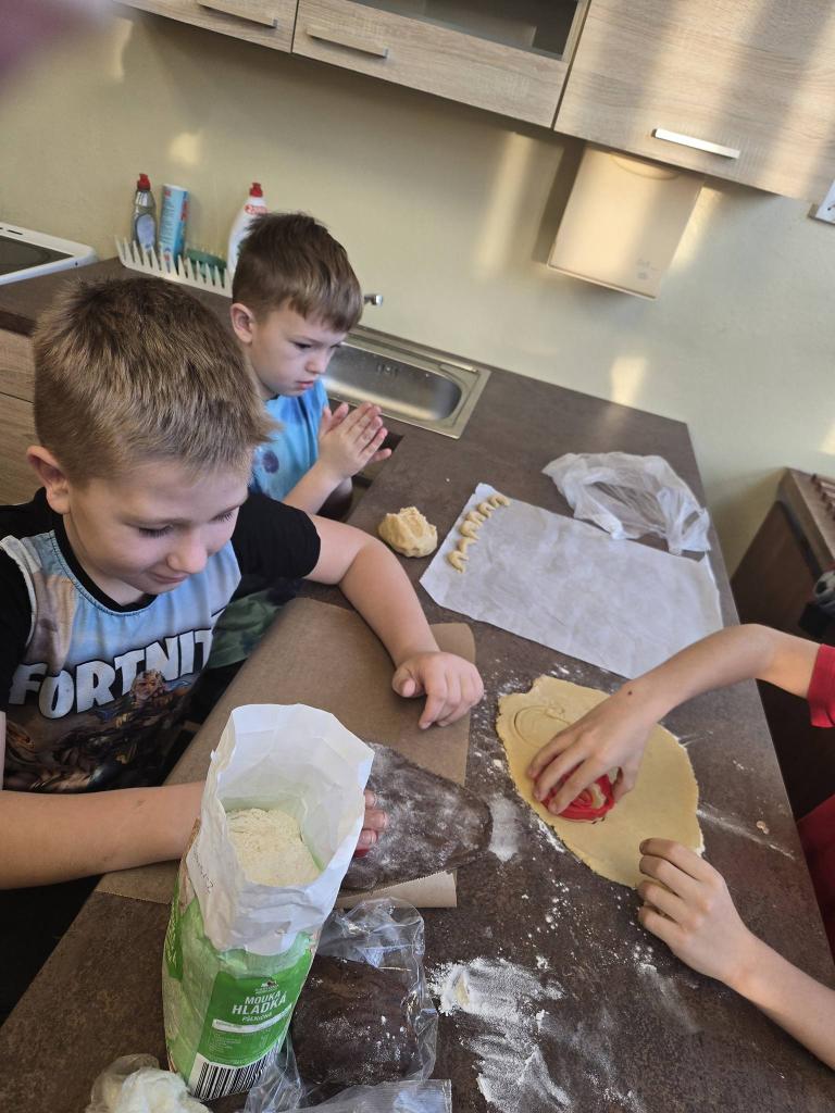 Nejprve připravená těsta vyváleli a poté s pečlivostí vykrajovali různé tvary – hvězdičky, kolečka i další oblíbené motivy. Hotové kousky skládali na plechy a nosili je k troubě. Atmosféra byla příjemná a všichni si společné pečení naplno užívali. Výsledkem byly plechy plné krásného a chutného cukroví, na které mohou být žáci právem hrdí. Den se vydařil a každý si odnesl nejen sladkou dobrotu, ale také hezký zážitek.