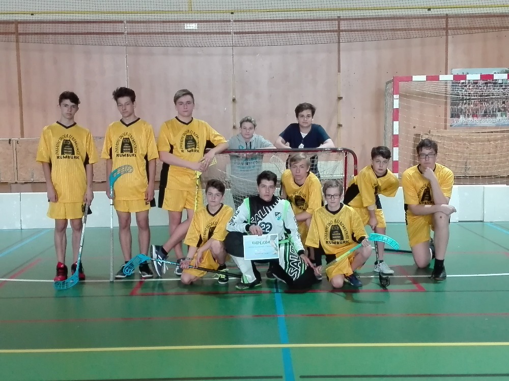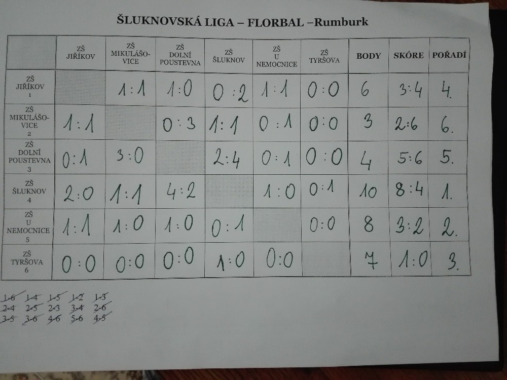 Matyáš Fanderlik, Filip Cobl, Filip Kucer, Matyáš Frinta, Tomáš Slavík, Adam Petříček, Láďa Všetečka a Dan Novák. Závěrem naše výsledky a poděkování za vzornou reprezentaci školy. Mikulášovice - 1:0 (Cobl), Dolní Poustevna 1:0 (Fanderlik), Jiříkov 1:1 (Cobl), Tyršova 0:0, Šluknov 0:1. Celkové pořadí: 1. Šluknov, 2. ZŠ U Nemocnice, 3. Tyršova, 4. Jiříkov, 5. Dolní Poustevna a 6. Mikulášovice. Poděkování za pomoc při organizaci turnaje patří ještě žákyni z naší 9.B Anetě Šlengrové.