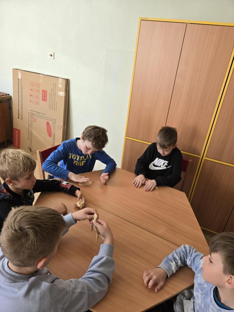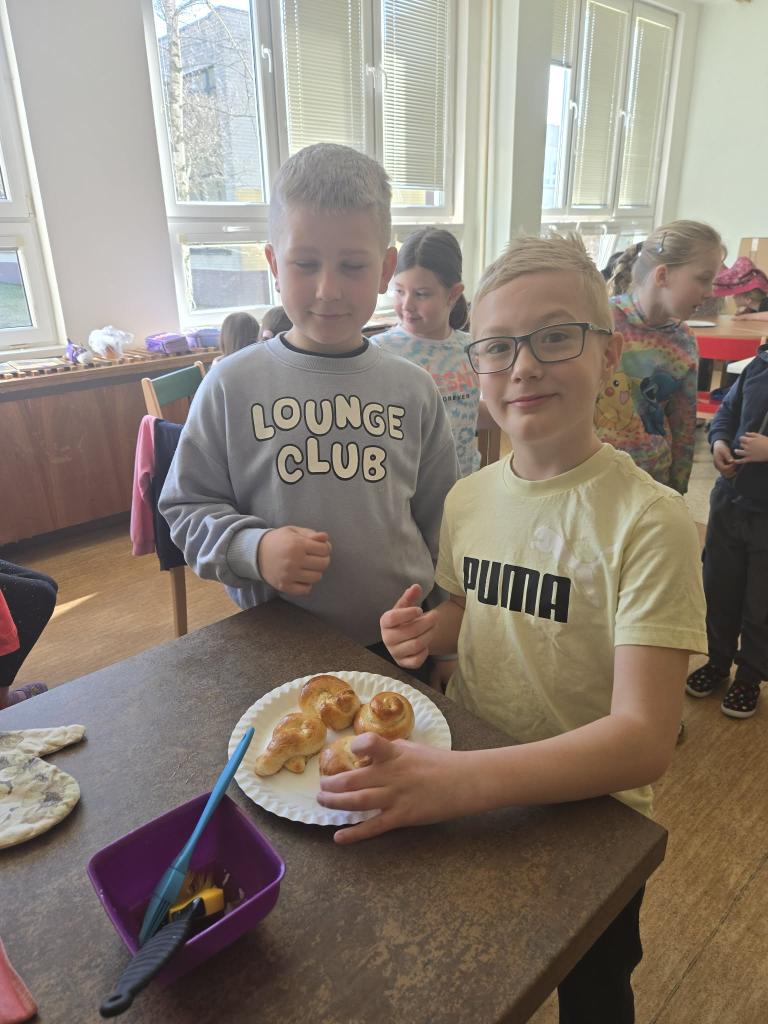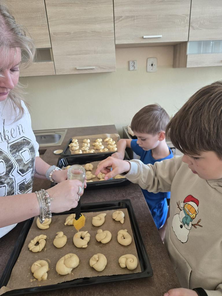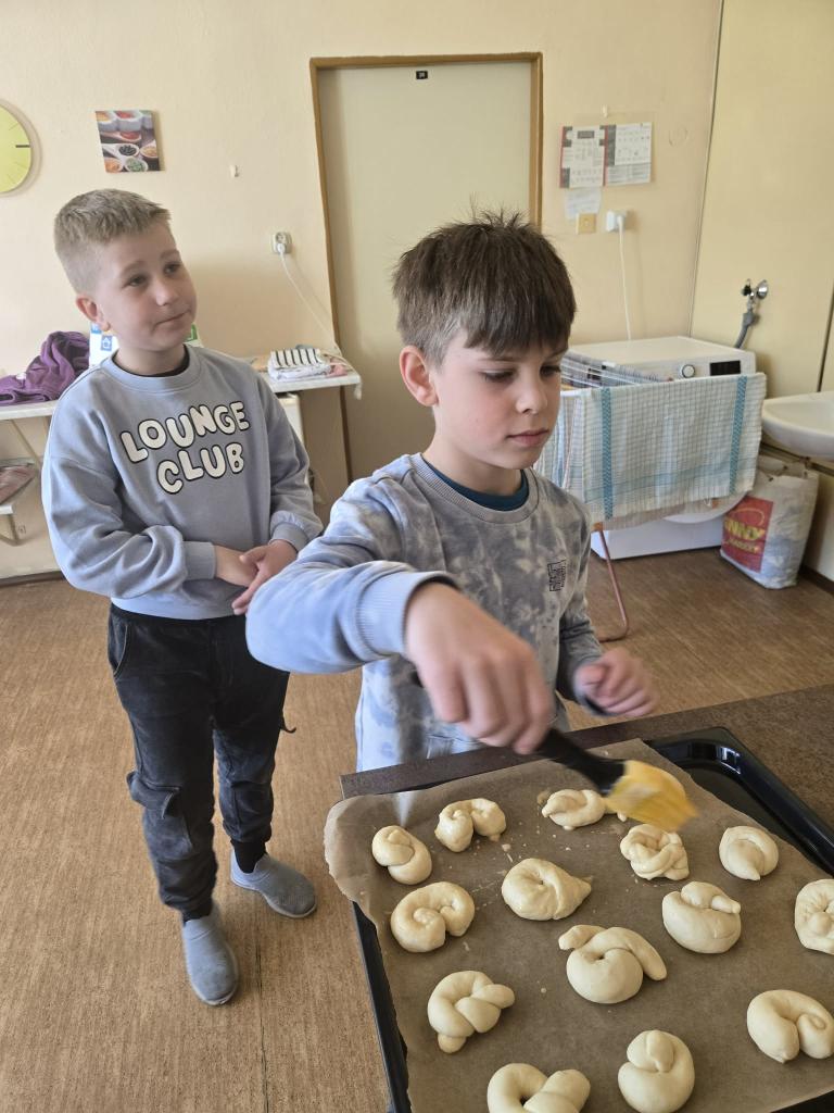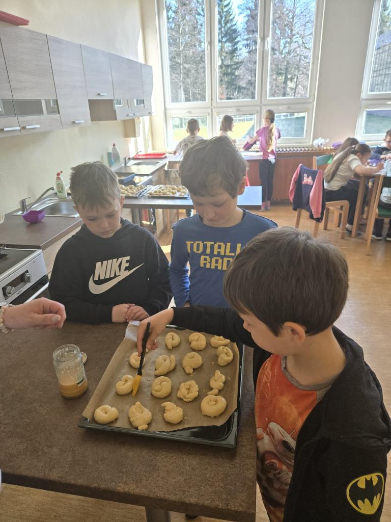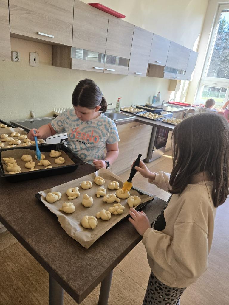 Připravené jidáše poté potřeli a vložili do trouby k upečení. Během pečení se kuchyňkou linula příjemná vůně čerstvého pečiva. Po upečení ještě žáci jidáše potřeli medem, který jim dodal krásný lesk a sladkou chuť. Celá akce proběhla v příjemné atmosféře a přinesla všem radost z vlastnoručně připravené velikonoční dobroty.